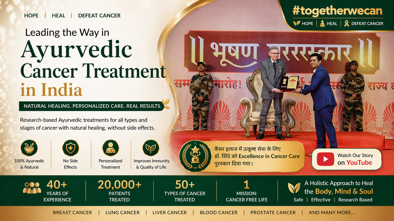 Based on its history and ancient theories, Ayurveda has its own methods of individualized therapy. Because, every type of disease and its cause are already interpreted in old scriptures. And cancer is no exception. Despite the fact that modern scientific approaches have not produced reliable evidence to support the Ayurveda method as a cancer treatment plan, numerous Ayurvedic practitioners in the Indian Subcontinent today have stated that they have had success curing cancers. Being their successor, Dr. Mayank Shinde with the bestowed attributes from his Guru, his Father Akhilesh Shinde┬а has come up with revolutionary ShindeтАЩs Ayurveda that brought a tremendous success rate without side effects.